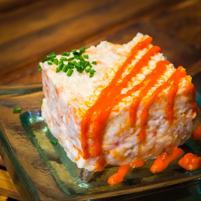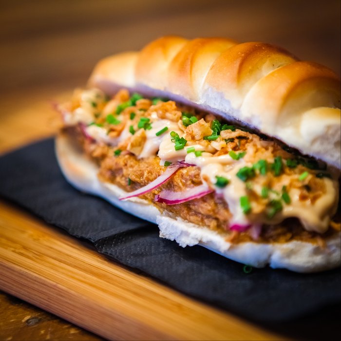 Brioche de Carne de Cerdo desmigada con 2 texturas de cebolla y salsa oishin. Con Amontillado.