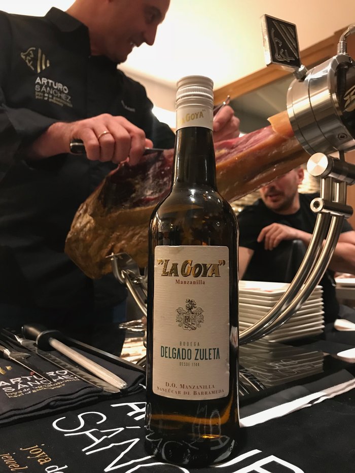 Aunque hay muchísimas combinaciones posibles con nuestros platos y los vinos de Jerez, pensamos que en una ciudad con poca tradición de vinos generosos, la puerta de entrada puede ser un gran jamón 100% ibérico de bellota Arturo Sánchez, con al menos 4 años de curación y dos montaneras, acompañado de una manzanilla pasada que exprese frescura pero también paso del tiempo. Ambos productos tienen así una conexión: han sobrepasado los tiempos que les correspondían, adquiriendo una nueva dimensión, nuevos matices y una historia propia. El tiempo y el mimo es el ingrediente que los hace diferentes.