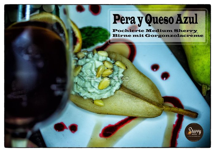 Pochierte Medium Sherry Birne mit Gorgonzola Sauce