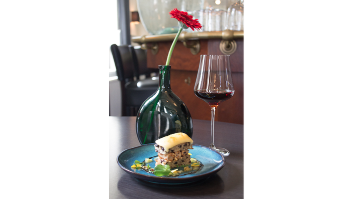 Een sandwich van kletzenbrood met ertussen twee cilinders crème van eendenlever gerold in amandel schaafsel, erop een lauwwarme Hervekaas en eromheen een krans van peren compote. Dit alles begeleid door een Moscatel van Gutiérrez Colosía.